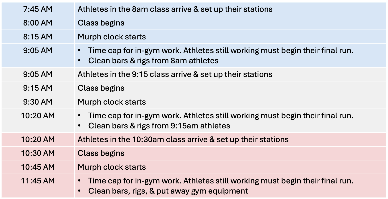 We’re capping each class at 25 athletes (5 per rig), and you need a reservation to join. No reservation = no Murph for you.Heads up: Sign-ups open 72 hours before class (not the usual 24). Set an alarm, set two alarms, steal your friend's alarm if you have to.